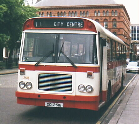 Citybus 2516 was missing its Bristol RE badge when parked in a deserted-looking Donegall Square East, one evening