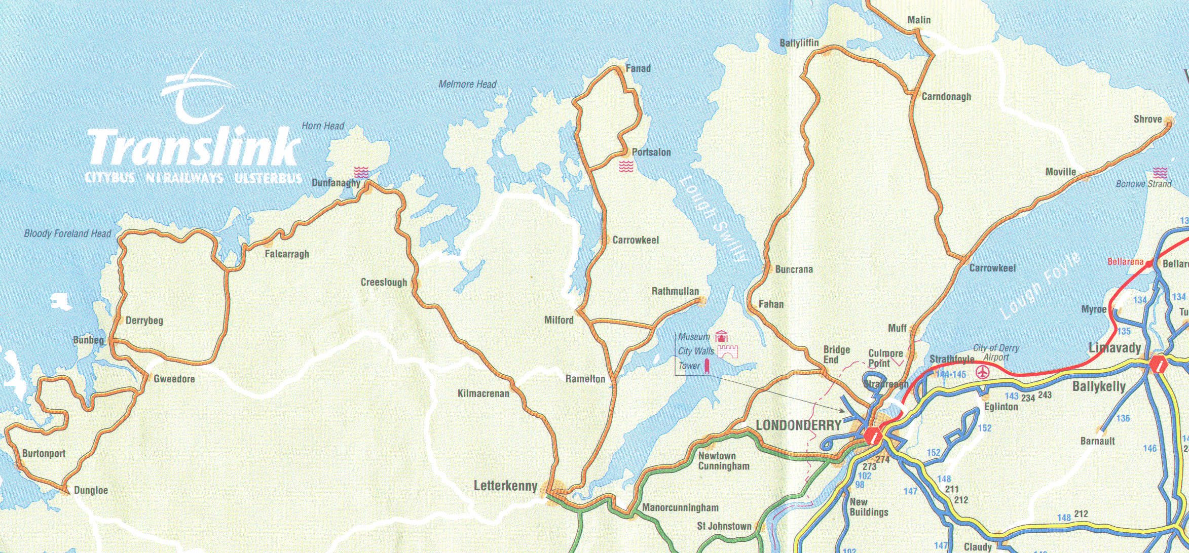 This map dates from 1955. A few of the routes shown are no longer operated as normal passenger services, but a copy of this map is still published in the Lough Swilly timetables so it can be considered as current.